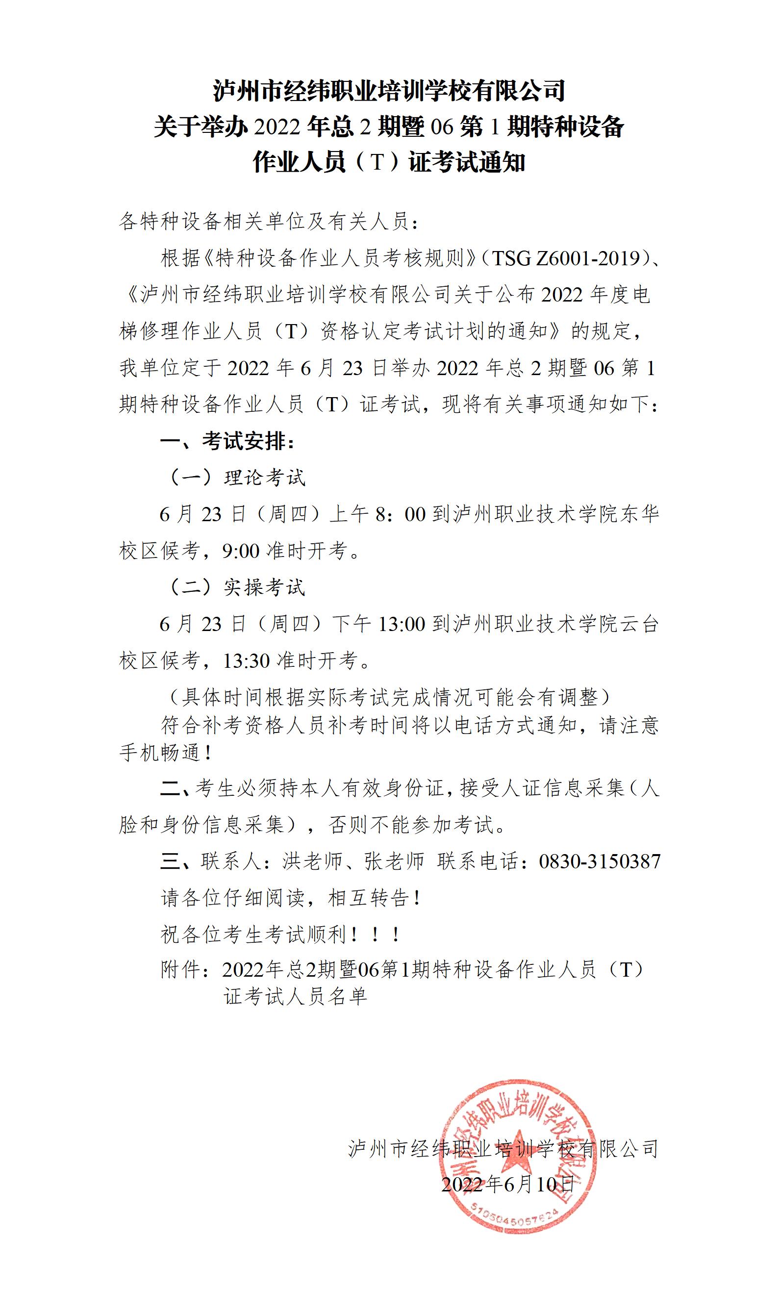 瀘州市經(jīng)緯職業(yè)培訓(xùn)學(xué)校有限公司關(guān)于舉辦2022年總2期暨06第1期特種設(shè)備工作人員(T)證考試通知