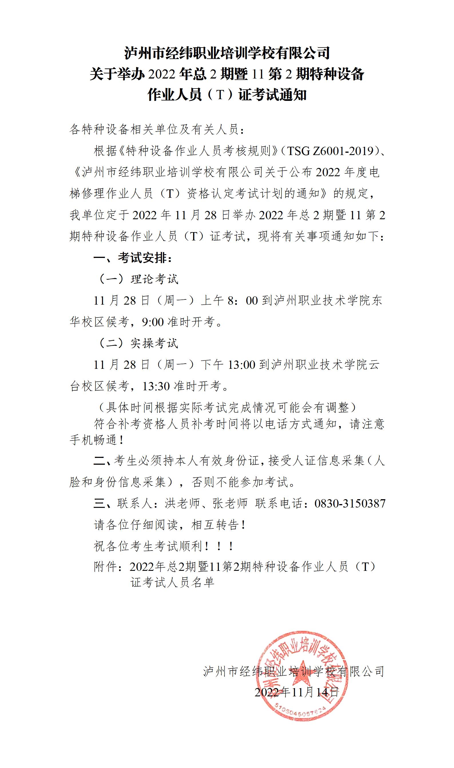 瀘州市經(jīng)緯職業(yè)培訓(xùn)學(xué)校有限公司關(guān)于舉辦2022年總第2期暨11第2期特種設(shè)備作業(yè)人員(T)證考試通知