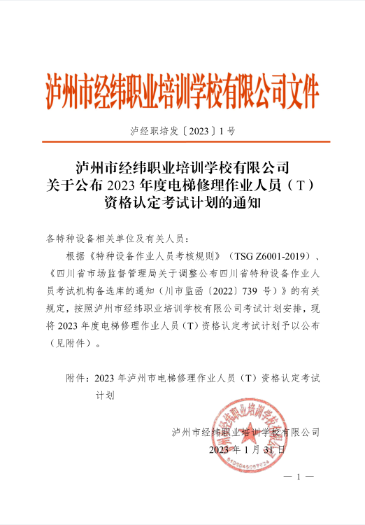 瀘州市經(jīng)緯職業(yè)培訓(xùn)學(xué)校有限公司關(guān)于公布2023年度電梯修理作業(yè)人員(T)資格認(rèn)定考試計(jì)劃的通知