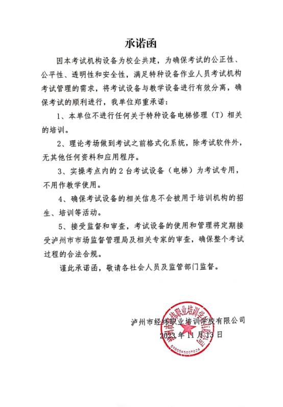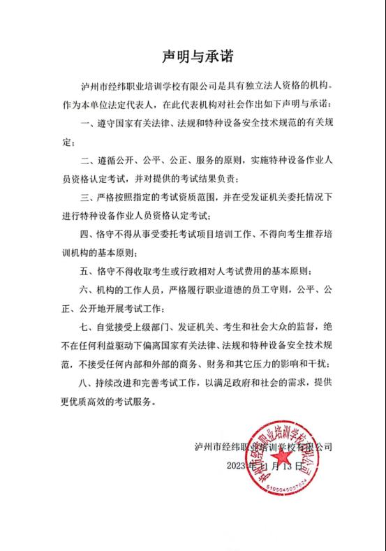 瀘州市經(jīng)緯職業(yè)培訓(xùn)學(xué)校有限公司關(guān)于特種設(shè)備作業(yè)人員考試機(jī)構(gòu)的聲明與承諾