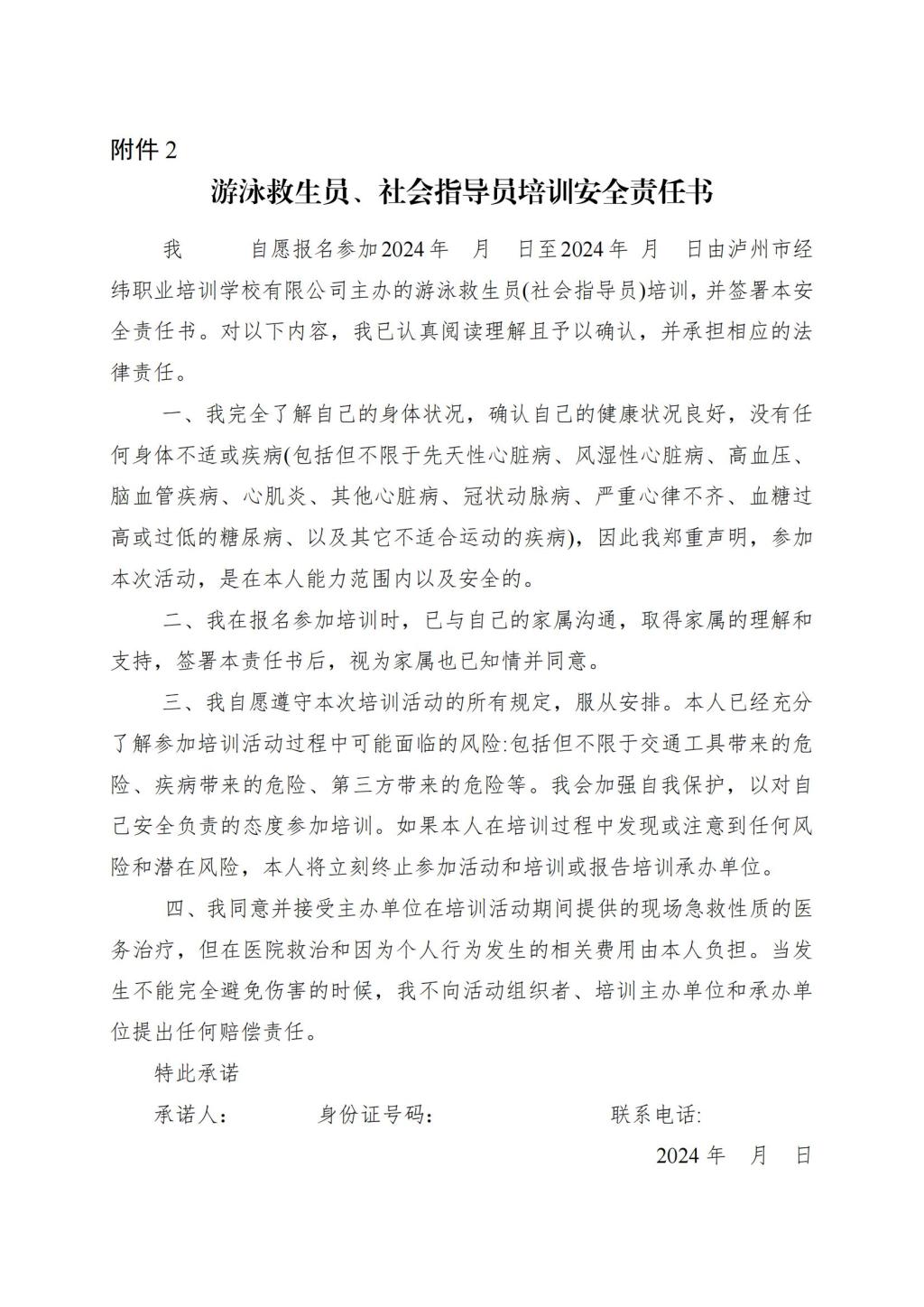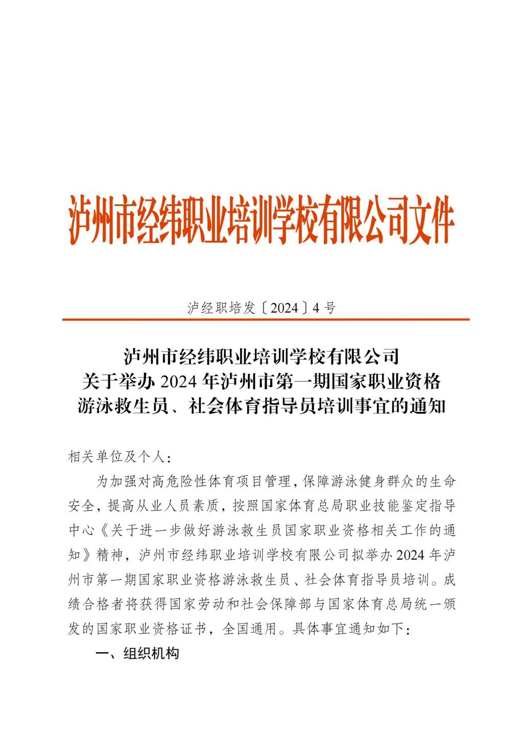 瀘州市經(jīng)緯職業(yè)培訓(xùn)學(xué)校有限公司關(guān)于舉辦2024年瀘州市第一期國(guó)家職業(yè)資格游泳救生員、社會(huì)體育指導(dǎo)員培訓(xùn)事宜的通知