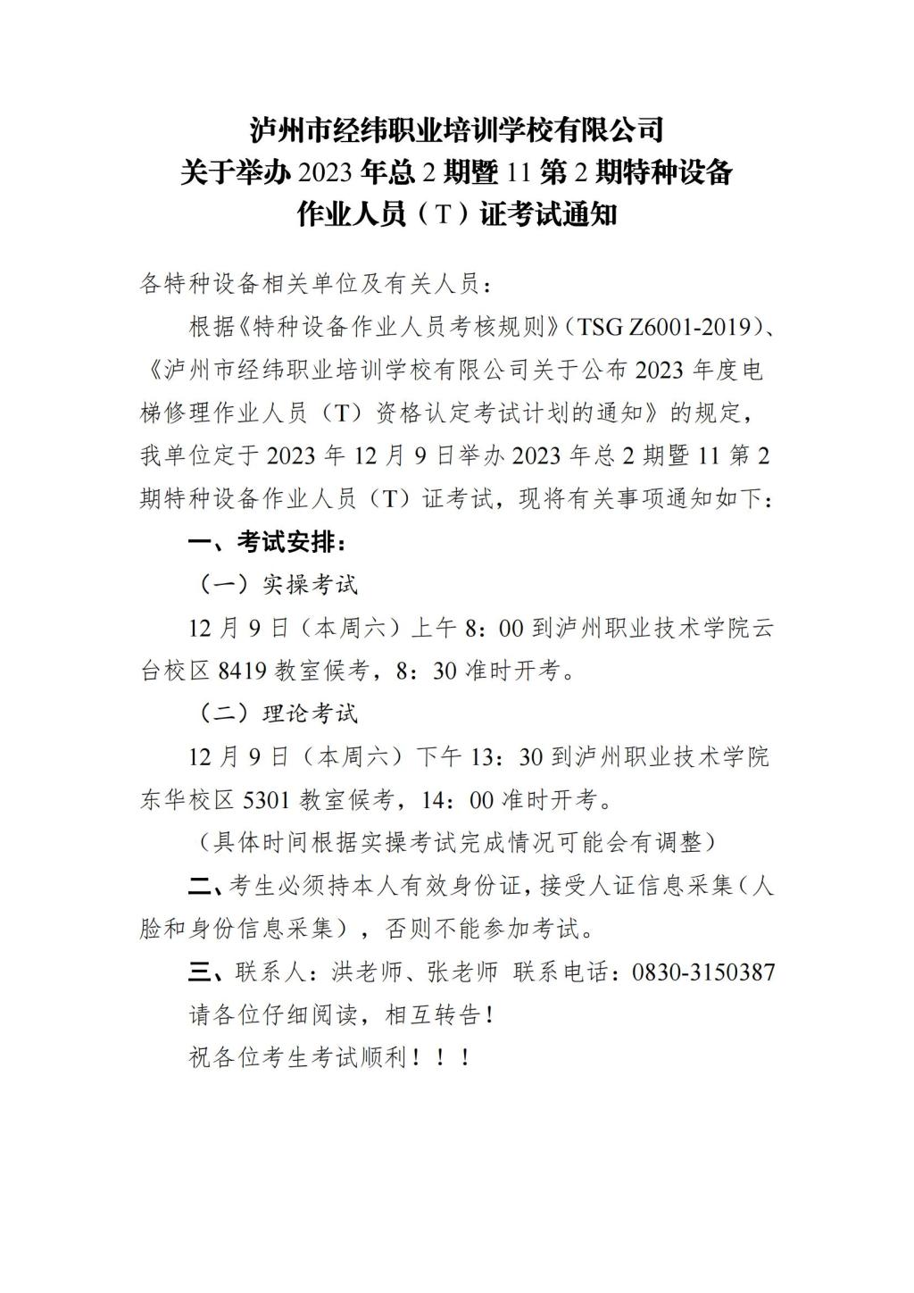 瀘州市經(jīng)緯職業(yè)培訓(xùn)學(xué)校有限公司關(guān)于舉辦2023 年總2期暨11第2期特種設(shè)備作業(yè)人員(T)證考試通知