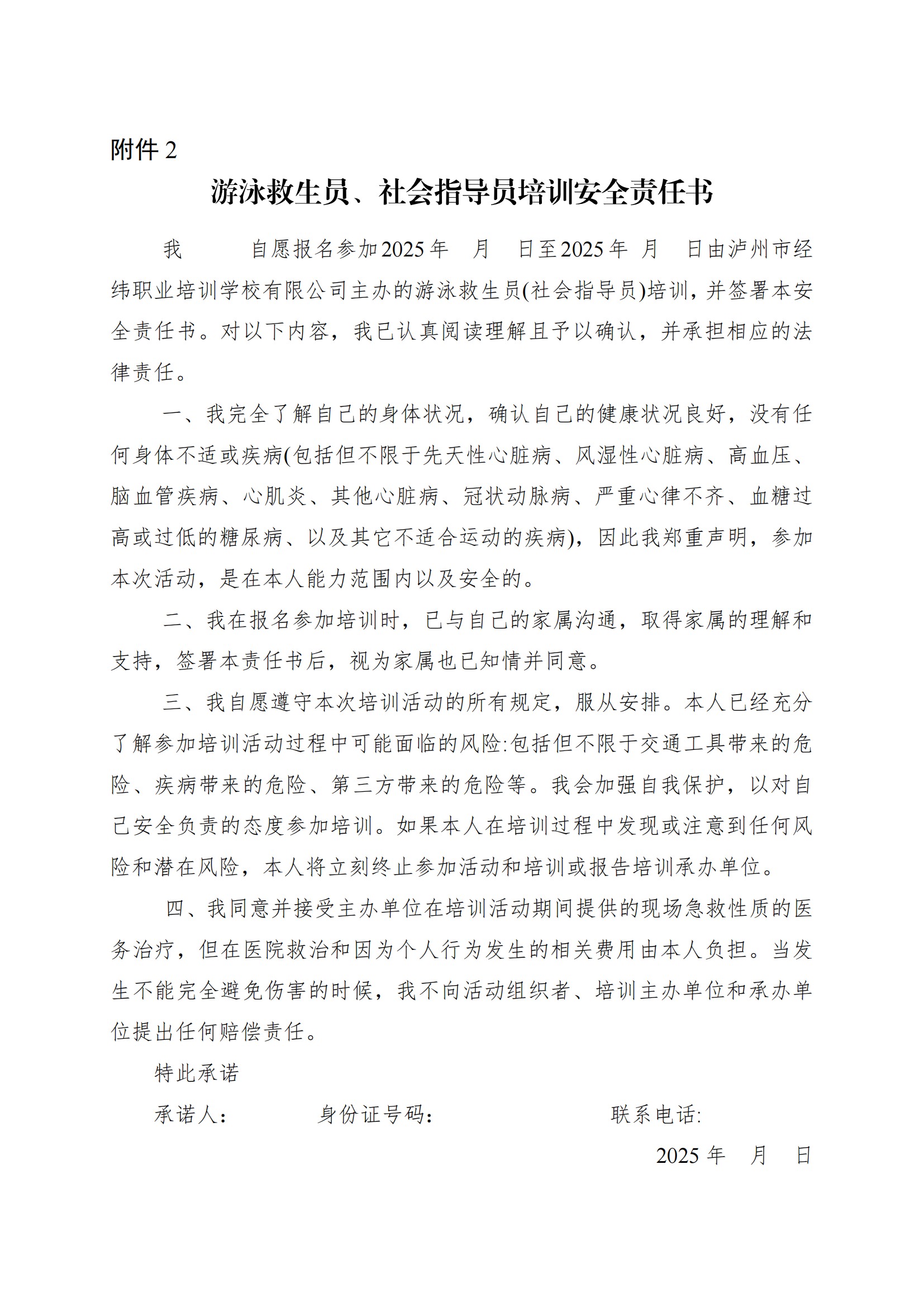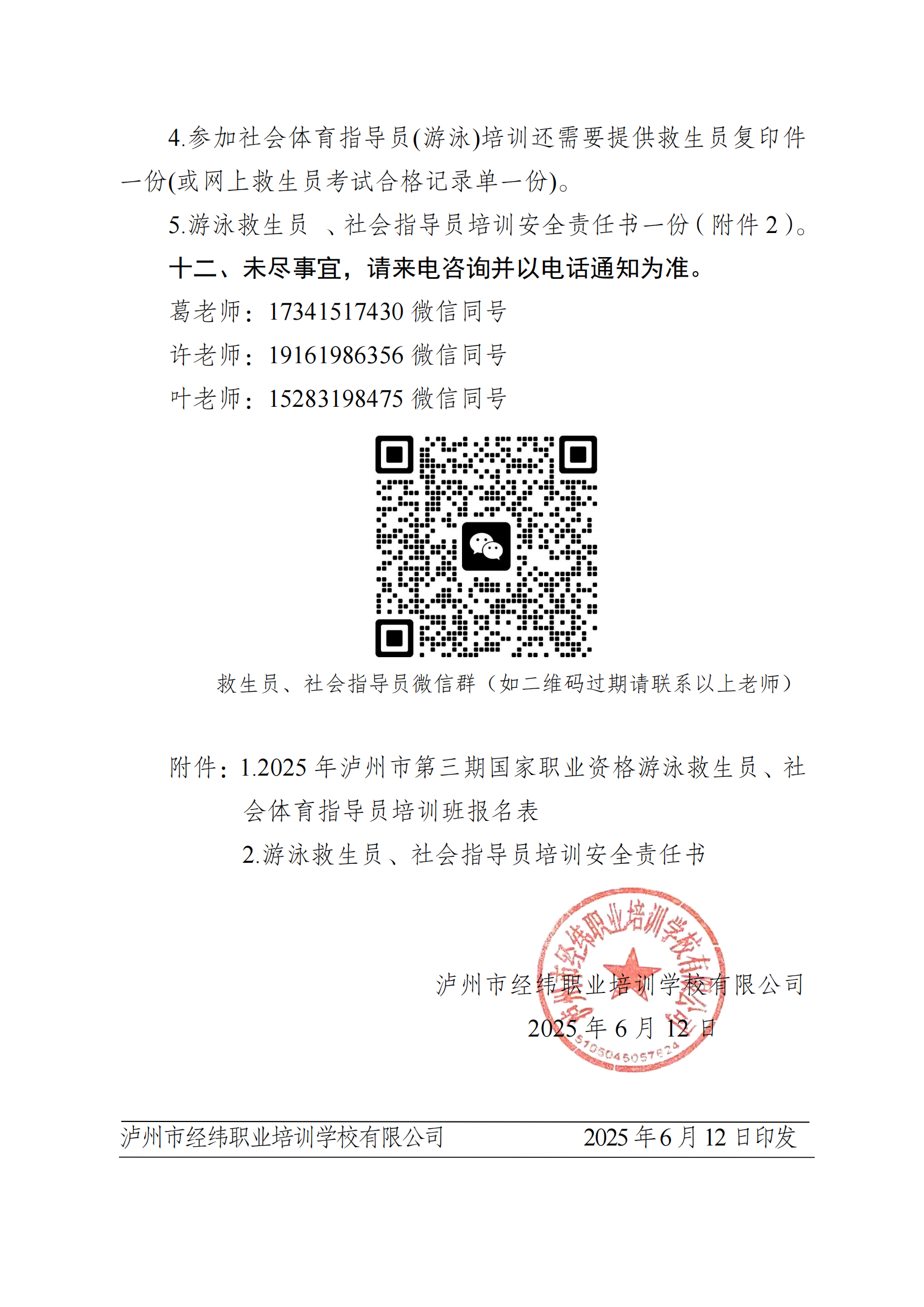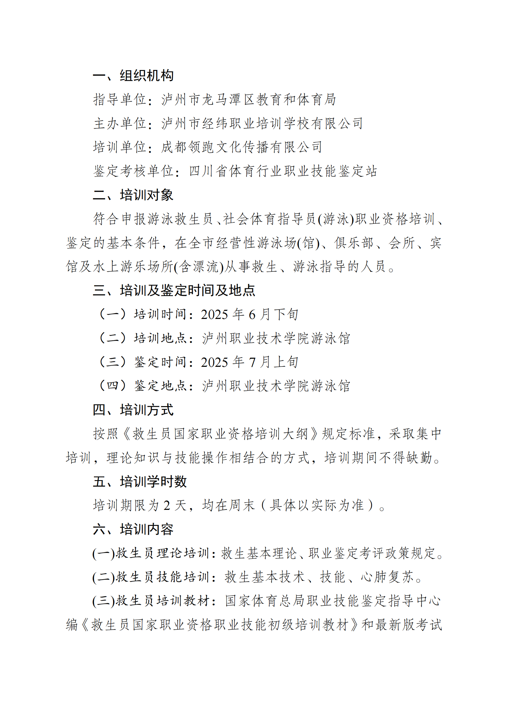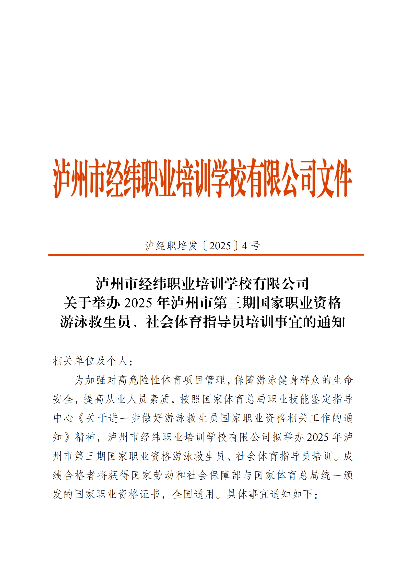 瀘州市經緯職業(yè)培訓學校有限公司 關于舉辦 2025 年瀘州市第三期國家職業(yè)資格 游泳救生員、社會體育指導員培訓事宜的通知